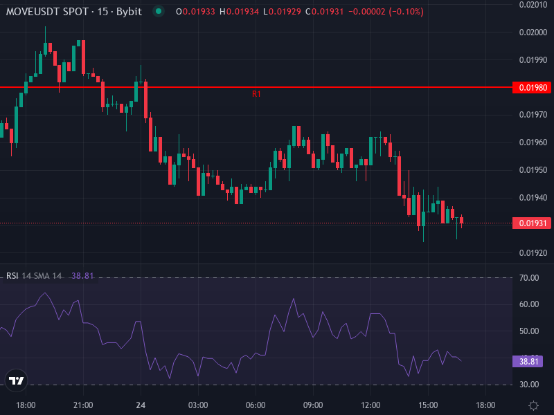 Price is trading below both the Simple Moving Average and Exponential Moving Average, both hovering around $0.01995. This confirms the bearish pressure isn’t letting up. Until MOVE can climb back above these levels with solid volume, any rallies are likely to get rejected pretty quickly.